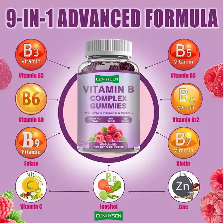 ผลิตภัณฑ์นี้คือ "วิตามิน B Complex Gummies" ของแบรนด์ Conhysen. มันมาในขวดที่มี 60 ธ อร์ gomme และติดป้ายเป็นอาหารเสริม