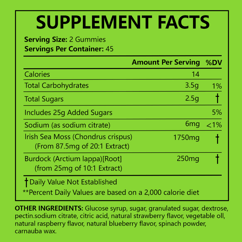 กัมมี่ Sea Moss ที่เปิดตัวโดยGuangdong Kangsheng Pharmaceutical Technology Co., Ltd.ผลิตจากไอร์ริชซีมอสคุณภาพสูงเป็นวัตถุดิบหลักและผ่านการขัดเกลาด้วยเทคโนโลยีสมัยใหม่ กัมมี่ Sea Moss ทำจากสารสกัดจากพืชธรรมชาติบริสุทธิ์และไม่มีสีเทียม สารกันบูด หรือกลูเตน เหมาะสำหรับคนทุกประเภท ผลิตภัณฑ์ได้รับการคิดค้นทางวิทยาศาสตร์เพื่อรักษาสารอาหารขนาดเล็ก 72 ชนิด เช่น ไอโอดีน แคลเซียม และแมกนีเซียมจากสาหร่ายทะเลอย่างสมบูรณ์แบบ มีการเติมน้ำผลไม้จากธรรมชาติเพื่อปรุงแต่งรสชาติที่เหมาะสำหรับทั้งเด็กและผู้ใหญ่ ผลิตภัณฑ์นี้เหมาะอย่างยิ่งสำหรับผู้ที่มีภูมิคุ้มกันต่ำ ผู้ที่มักจะนอนดึก และผู้ที่มีอาหารไม่สม่ำเสมอ สูตรเฉพาะของGuangdong Kangsheng Pharmaceutical Technology Co., Ltd.ช่วยเสริมสร้างสมรรถภาพทางกาย ปรับปรุงการทำงานของระบบย่อยอาหาร และส่งเสริมการเผาผลาญ