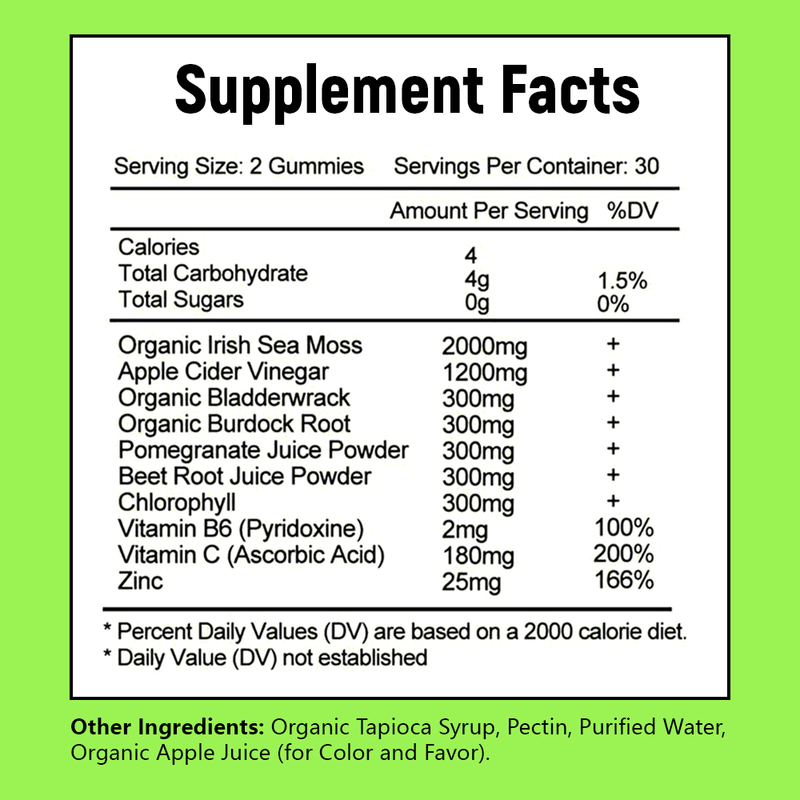 ไอริชซีมอสออร์แกนิก, บลัดเดอร์แวร์ออร์แกนิก, รากเบอร์ดอกออร์แกนิก, น้ำส้มสายชูหมักจากแอปเปิล, ผงน้ำทับทิม, ผงน้ำบีทรูท, สังกะสี, วิตามิน B6, วิตามิน C, คลอโรฟิลล์