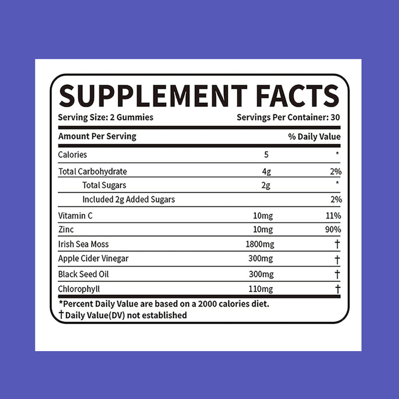 สาหร่ายทะเลไอริช, น้ำส้มสายชูหมักจากแอปเปิล, สังกะสี, วิตามินซี, คลอโรฟิลล์, น้ำมันเมล็ดดำ