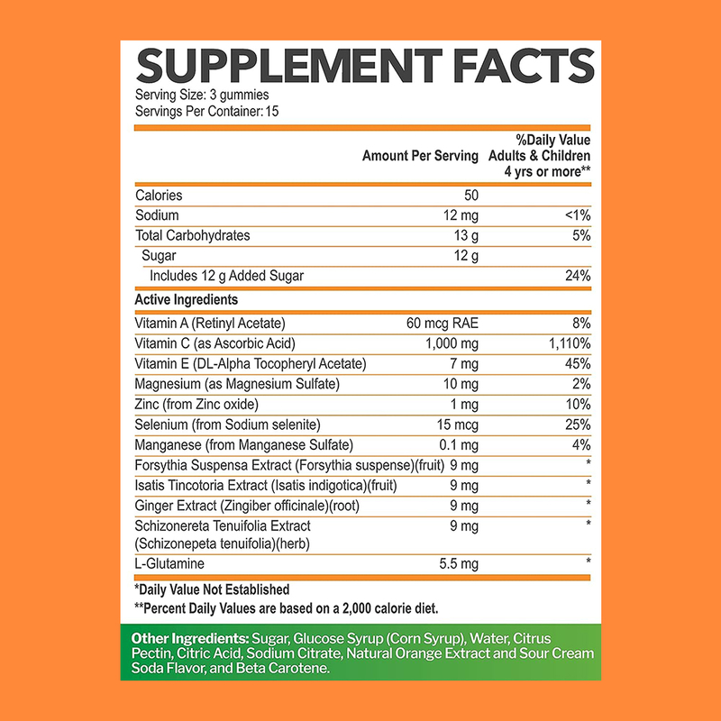 วิตามินซี, วิตามินเอ, วิตามินอี, สังกะสี, แมกนีเซียม, ซีลีเนียม, แมงกานีส, สารสกัดจากขิง, สารสกัดจากดอกฟอร์ซิเธีย, สารสกัดจากไอซาติส, สารสกัดจากชิโซเนเรตา เทนูอิโฟเลีย, แอล-กลูตามีน