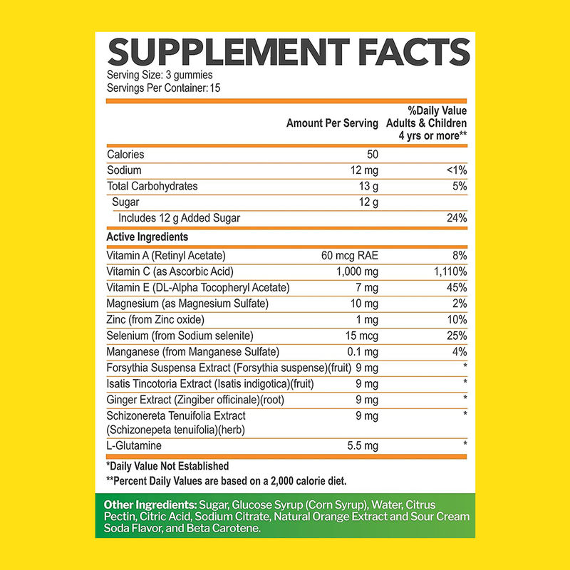 วิตามินซี, วิตามินเอ, วิตามินอี, สังกะสี, แมกนีเซียม, ซีลีเนียม, แมงกานีส, สารสกัดจากขิง, สารสกัดจาก Forsythia Suspensa, สารสกัดจาก Isatis Tincotoria, สารสกัดจาก Schizonereta Tenuifolia, แอล-กลูตามีน