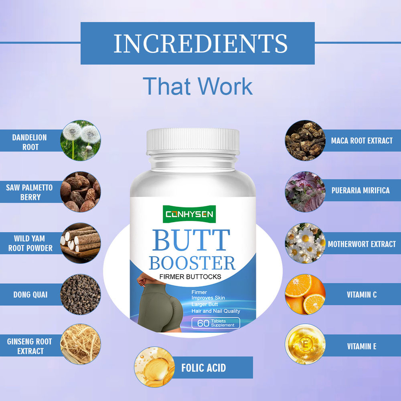 The Butt Booster Tablets เปิดตัวโดยบริษัท กวางดง คังเชง เทคโนโลยียา จํากัดเป็นอาหารเพื่อสุขภาพ ที่ถูกออกแบบมาโดยเฉพาะเพื่อสร้างรูปร่างกระโปรงเป้าหมายคือ ช่วยปรับปรุงรูปร่างของกระโปรงและเพิ่มความยืดหยุ่นของผิวหนังสารประกอบหลักประกอบด้วยคอลลาเจน ไซโอฟลาวอน ฯลฯ สารประกอบเหล่านี้ช่วยส่งเสริมการไหลเวียนเลือดในท้องถิ่นและสนับสนุนสุขภาพของเนื้อเยื่อเชื่อมต่อบริษัท กวางดง คังเชง เทคโนโลยียา จํากัดมีระบบการจัดการการผลิตที่สมบูรณ์แบบ ทุกชุดของผลิตภัณฑ์ต้องผ่านการตรวจคุณภาพหลายครั้ง เพื่อรับรองความปลอดภัยและประสิทธิภาพและมุ่งมั่นที่จะให้บริการกับผู้บริโภคด้วยการแก้ไขสุขภาพที่ปลอดภัยและมีประสิทธิภาพ.