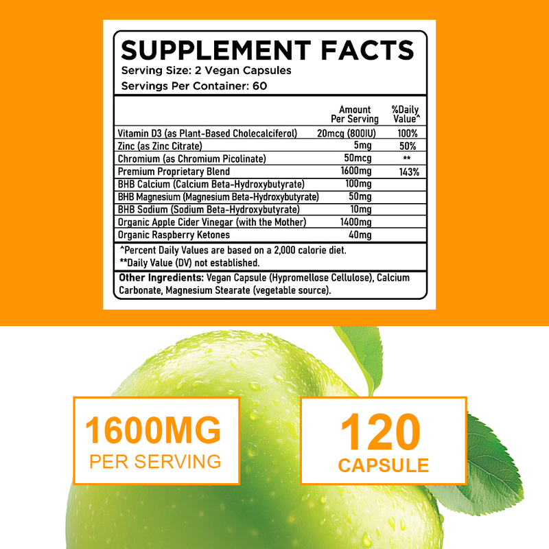 น้ำส้มสายชูหมักจากแอปเปิลออร์แกนิก, วิตามิน D3, สังกะสี, โครเมียม, ส่วนผสมสูตรเฉพาะระดับพรีเมียม, BHB แคลเซียม, BHB แมกนีเซียม, BHB โซเดียม, ราสเบอร์รีกีโตนออร์แกนิก