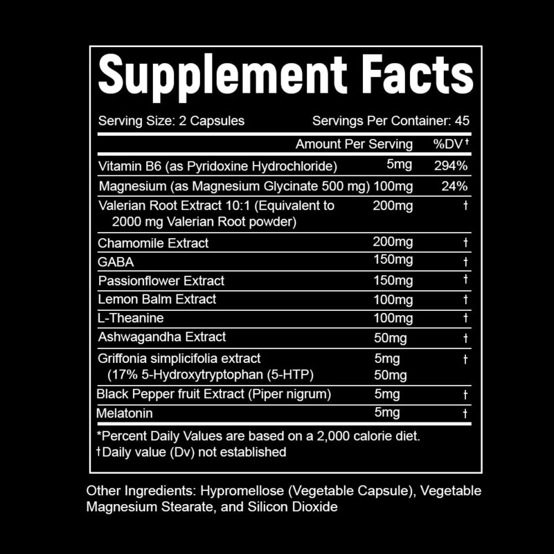 วิตามิน B6, แมกนีเซียม, สารสกัดจากรากวาเลอเรียน, สารสกัดจากดอกคาโมมายล์, GABA, สารสกัดจากดอกเสาวรส, สารสกัดจากเลมอนบาล์ม, แอล-ธีอะนีน, สารสกัดจากอัสวากันธา, สารสกัดจากกริฟโฟเนีย ซิมพลิซิโฟเลีย, สารสกัดจากพริกไทยดำ, เมลาโทนิน